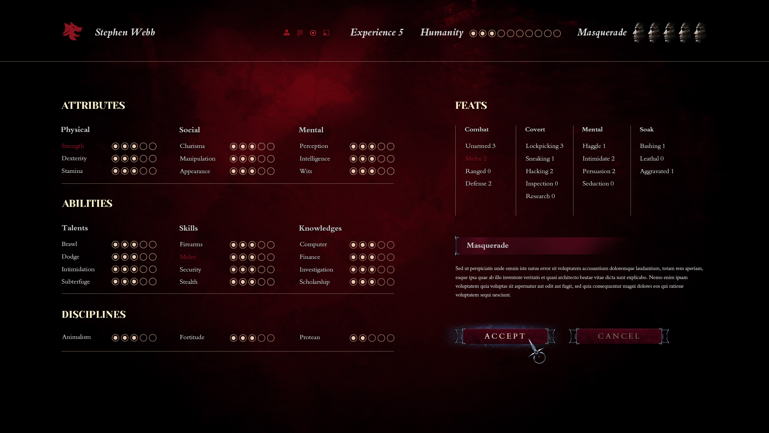 When I was asked by Stephen to join him and Arthur on this project I happily agreed. Bloodlines was one of my favorite RPG games I had ever played and I was eager to start developing new visuals for the game. Bloodlines had amazing atmosphere, deep character development and a ton of replayability. It is well known that the development team had a lot on their shoulders when trying to rush the product to meet the deadline. It was also the first game on the brand new engine, Source. As much as I have enjoyed the game, there is many improvements that can be done, enhancing the gameplay even further and pumping some new blood in to this classic. One of these improvements is the UI design.